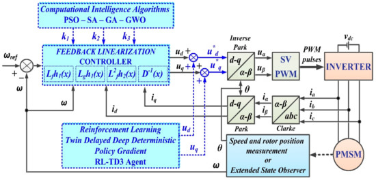 Though the linearization of the model in Section 2 was performed in the classical manner, in this section, the linearization of the nonlinear model (1) of the PMSM will be performed by using the feedback linearization control method. Thus, Figure 3 shows the proposed PMSM–CS–CI control block diagram based on an FL-type controller. The parameters of control laws ud and uq will be optimized with CI methods. Furthermore, an optimization of the performance of PMSM–CS–CI will be presented by using an RL-TD3 agent for CCSs.