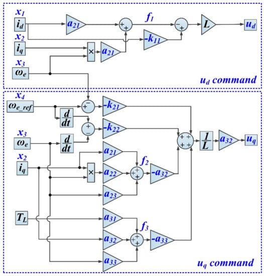 The control laws ud and uq can be inferred with components from Equation (26), as in the relations below, and Figure 4 presents the synthesis of the implementation of controls ud and uq based on the input variables, states, and parameters of the vector , which will be optimized with CI methods.