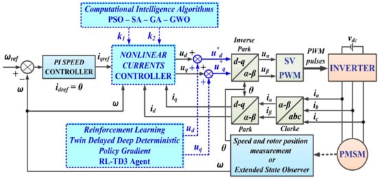 Thus, Figure 5 shows the proposed PMSM–CS–CI control block diagram based on a nonlinear-type controller in which the FOC-type control structure is kept. The parameters of the control laws ud and uq will be optimized with CI methods. Moreover, an optimization of the PMSM–CS–CI performance will be presented by using an RL-TD3 agent for the CCS.