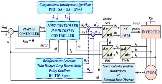 Thus, Figure 7 shows the control block diagram of the proposed PMSM–CS–CI based on the PCH controller, in which the FOC-type control structure is kept. The parameters of the control laws ud and uq will be optimized with CI methods. Moreover, an optimization of the PMSM–CS–CI performance will be presented by using an RL-TD3 agent for the CCS.