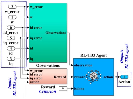 In addition, a special role in improving the performance of PMSM–CS is played by the use of the RL-TD3 agent algorithm. RL is a framework for learning the relationships between states that are characteristic of the description of a system and the actions on it. An agent performs the maximization of a reward based on the actions on the system while also taking observations of the system into account. Thus, a similarity between the interaction of this RL-TD3 agent with a controlled process and that of a controller can be noted [35,36,37,38].