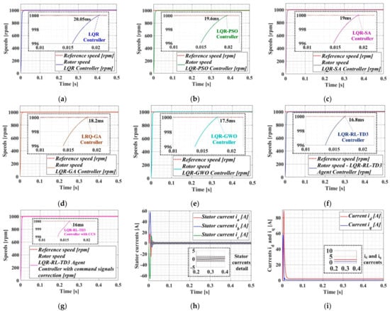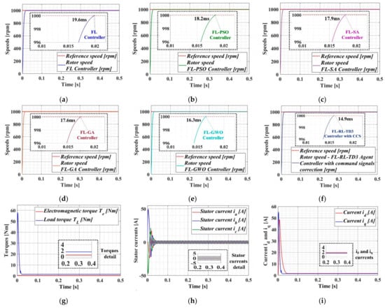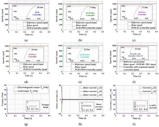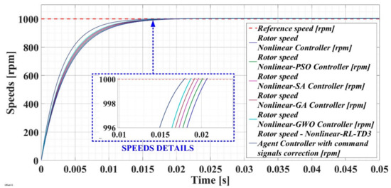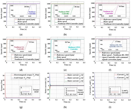 One of the advantages of the RL-TD3 agent is that it does not use a mathematical model of a controlled process, but provides CCS after the training stages in order to improve the performance of PMSM–CS. Therefore, starting from the PMSM–CS performance obtained for a benchmark, this article presents four types of linear and nonlinear control algorithms for the control of a PMSM, together with a means of improving the PMSM–CS performance by using CI algorithms and the RL-TD3 agent algorithm.