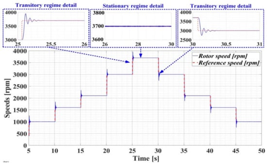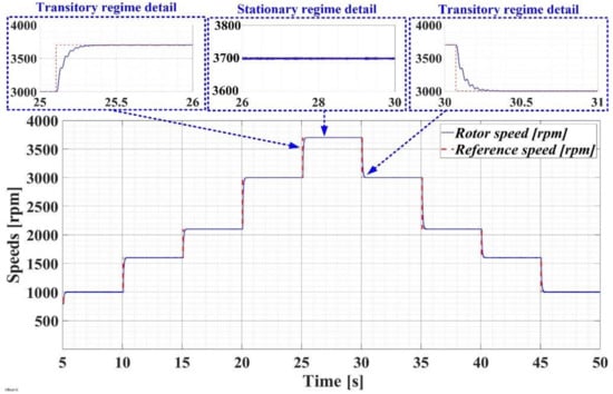 The evolution of the PMSM–CS–CI is presented in Figure 24 for a series of reference speed step signals, a load torque of 1 Nm, and an FOC-type control algorithm with a classical PI-type controller. An overshooting of approximately 5% and a steady-state error of less than 1% were noted for both the positive and negative steps of the speed reference of the PMSM rotor.