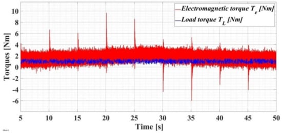 It can be specified that the torque load of 1 Nm was provided by the TP 1410 drive system connected to the PMSM shaft. The TP 1410 servo-brake and drive system were programmable and could be used as a load for the PMSM in order to simulate the load torque. The main characteristics of the TP 1410 servo-brake and drive system in terms of the load of the PMSM were a speed ranging between −4000 and 4000 rpm and a maximum braking power of 400 W.