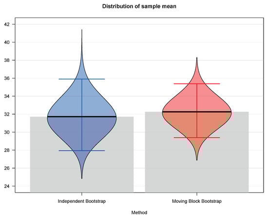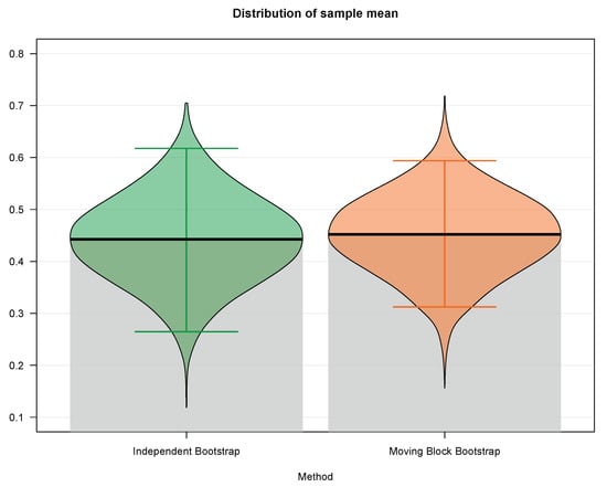A plethora of types of block bootstrap techniques were suggested. A comprehensive summary is provided by [6]. In general, the way of drawing the blocks of observations defines the difference among the block bootstrap versions. Bootstrapping blocks, which do not overlap, is performed in the non-overlapping block bootstrap. Since some observations are not allowed to be joined into the same block, this approach is less efficient for estimation [20]. Therefore, the moving block bootstrap (MBB) is considered here. The key idea of the MBB is forming the consecutive block of observations from the previous one through shifting the “stacking window” by one observation ahead. The MBB technique for the sample mean of multivariate observations is described in Procedure 2 in detail.