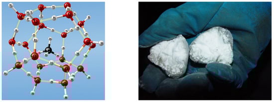 Gas hydrates are crystalline, solid substances consisting of water molecules linked by hydrogen bonds, thereby forming cavities, and molecules of other substances contained in these cavities [1,2]. In nature, such substances are most often methane, ethane, propane and carbon dioxide. The formation of mixed hydrates containing various substances in the cavities is also possible. The crystalline structure and filling of the gas hydrates’ cavities depend on the guest molecule and the conditions of the hydrate formation. The composition of gas hydrates is usually determined by the expression M·nH2O, where n is the number of water molecules per one guest molecule. One cubic meter of methane hydrate contains about 160 m3 of gas reduced to standard conditions (273.15 K and 101,325 Pa) and about 0.8 m3 of water. Figure 1 shows a cavity containing a methane molecule and the physical appearance of gas hydrates [3].