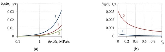 Change in porosity with time depending on the changes in total pore pressure (a) and hydrate saturation (b). (a) Lines 1, 2 and 3 correspond to Sh = 0, 0.3 and 0.6. (b) Lines 1 and 2 correspond to ∂pt/∂t = 0.1 and 1 MPa/s.