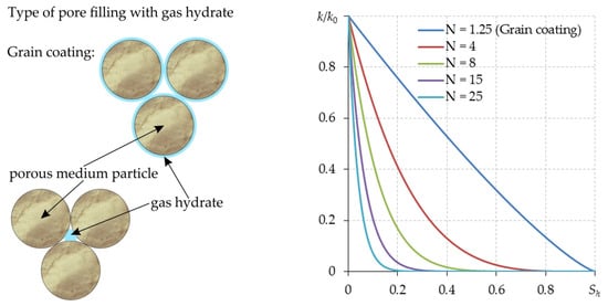 Here, k0 is the porous medium’s permeability in the absence of hydrate, m2. The exponent N depends on the pore-filling type of gas hydrates (Figure 4).