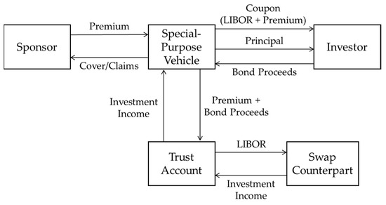 - Coval, J.D.; Jurek, J.W.; Stafford, E. Economic catastrophe bonds. Am. Econ. Rev. 2009, 99, 628–666. Available online: http://www.jstor.org/stable/25592477 (accessed on 13 July 2022). [CrossRef]