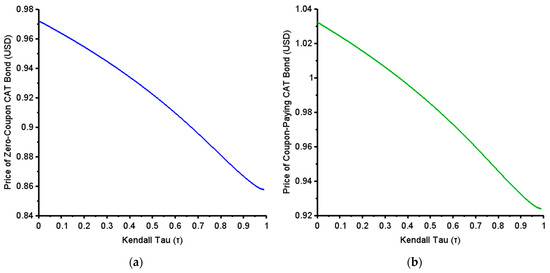 Figure 5 shows that the Kendall tau correlation rates of trigger events are inversely proportional to zero-coupon and coupon-paying MECB prices. Rationally, it makes sense because if the value of the Kendall tau correlation rate of events is high, then the probability that the attachment points of the loss and fatality aggregates are exceeded is also high. This high probability causes investor interest in their involvement in MECBs to decline. This decline in investor interest occurs because they do not want to risk too significant a loss. So, the price also declines.