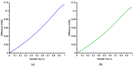 Next, we analyze the difference between the MECB price that involves and does not involve the correlation rate of events. By using the variable values at points (a), (b), (c), (d), (f), (g), (h), and (i) in Section 5.5, the difference between the MECB price that involves and does not involve the correlation rate of events for each tau is visually presented in Figure 6.