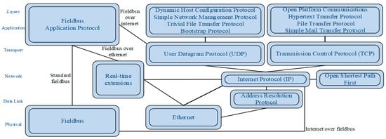 Structure of Ethernet and fieldbus in relation to protocol stack based on TCP/IP model.