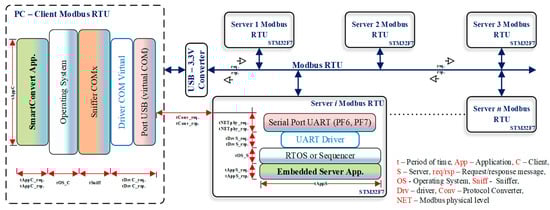 Our contributions with the study include the analysis of Modbus transmission: we measured the Modbus communication signals with an oscilloscope. Thus, we evaluated the delays corresponding to different configurations of the server stations using a different number of messages, i.e., different sizes. Studies of this type are not found in the applied science literature, e.g., in the field of embedded systems. Moreover, we proposed a Modbus extension, thereby improving Modbus message merging and thus reducing communication times and improving data flow on RS485 networks. These proposals and studies were based on the analysis in the first part of the study, in an architecture that incorporates the Modbus protocol, SmartConvert, STM32F7, and RTX RTOS. In future studies, we will use the LTM2881 driver for RS485. Another contribution concerns the measurement of the delays introduced by the Windows 10 operating system with an average load in the communication between the PC client and the server stations.