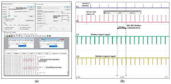 We connected the PC and development kit with a USB–3.3 V converter (on the serial port) identified as a Prolific USB-to-Serial-Comm Port (COM10). Figure 4a shows the Modbus poll and two server stations with addresses 0x01 and 0x02. One register was read from server ID = 0x01 using the FC03 Modbus function. The register was written to the server with ID = 0x02, at memory address 0x00, with the related time stamps. In terms of acquisition cycle experimental data, the cursors delimited a two-server acquisition cycle. We connected four probes (Ci signals in this paper) of the oscilloscope as follows (Figure 4b): probe 1 (C1) to an output pin of the microcontroller (pin PF8) that indicated the Server 1 station marker, probe 2 (C2) to an output pin of the microcontroller (pin PF9) as a spy to indicate the send/receive status of Server i, and probes 3 (C3) and 4 (C4) to UART (RX, pin PF6; TX, pin PF7). In the laboratory experiment, we used RX and TX lines for testing, which we directly connected between two client–server devices, a USB–3.3 V adapter, and a server station emulator (up to 256 stations). We implemented a half-duplex connection, so we used no RTS/CTS signals or line drivers to control their direction. The STM32F7 microcontroller automatically used RTS to switch the communication direction, even if a line driver was used. The measured values for the period of an acquisition cycle with two Modbus RTU server stations were as follows: 199.8, 200.5, 200.7, 200.2, and 196.9 ms. The experimental results showed that the time period related to the server with address 1 was between 196.9 and 200.7 ms.