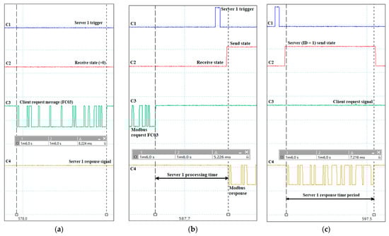 Modbus protocol experimental tests: (a) server query message timing with ID 0x01 and function FC03; (b) time required for processing at server with ID = 0x01 and FC03 (analysis of request and sending response; forced delay = 1 ms); (c) time required for response message of server with ID 0x01 and function FC03.