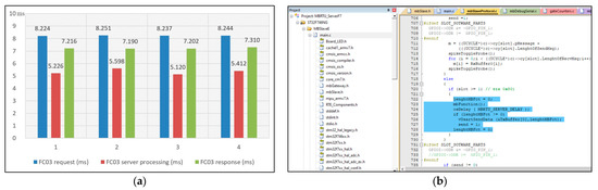 Measured times and microcontroller software application: (a) measured times corresponding to FC03 and FC16 Modbus functions; (b) Modbus server protocol development using Keil uVision environment.