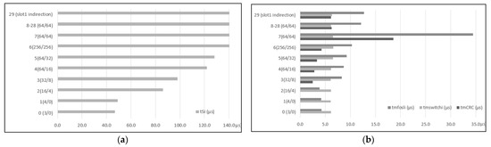 Measured times for acquisition cycle slots at client: (a) periods for tSi corresponding to ModbusE acquisition slot; (b) jitter for tmfosli, tmswitch, and tmCRC times with ModbusE extension.