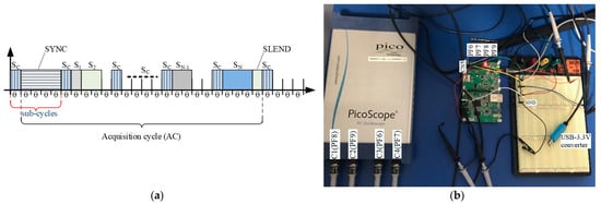 ModbusE acquisition cycle and related laboratory tests: (a) proposed solution for control loop acquisition period that is shorter than acquisition cycle; (b) practical measurements related to Modbus communication acquisition cycle.
