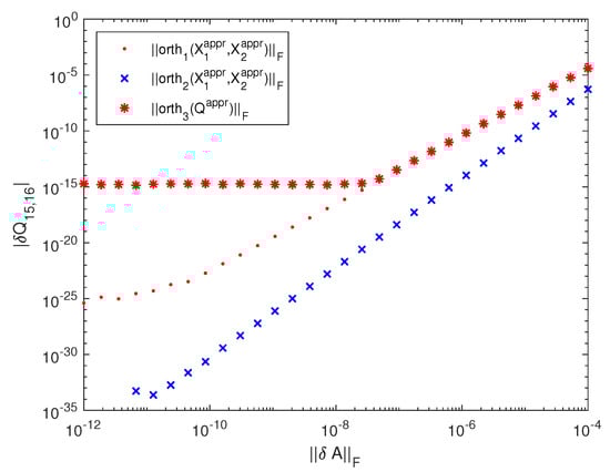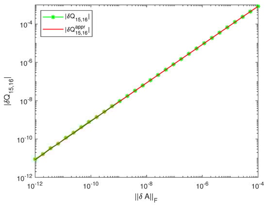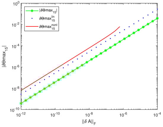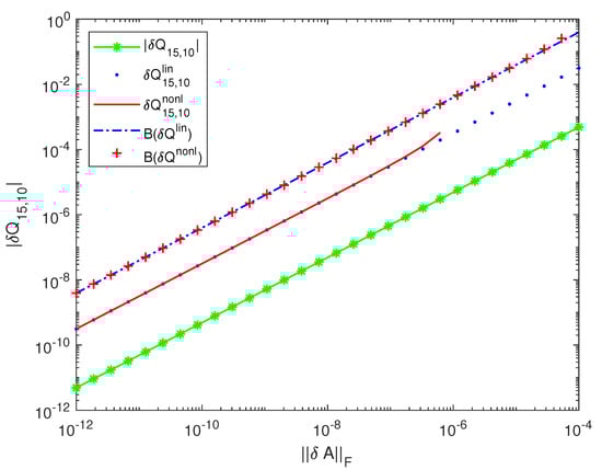 The bounds of the quantity (the maximum angle between the perturbed and unperturbed range of A), shown in Figure 6, are close to the exact value of this angle, with the nonlinear bound being slightly greater than the linear one. The normwise linear and the nonlinear bounds obtained in [17,23], are more than 75,000-times greater than the linear and the nonlinear bounds of the diagonal element , shown in Figure 7. Similarly, the normwise bounds and are more than 13,000-times greater than the bounds and as shown in Figure 8. This large difference between the sizes of the actual component perturbations of R and the normwise bounds is explained by the large condition number of the computed R—equal to . (Note that ).