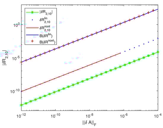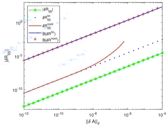 These bounds are more than 12-times larger than the norms of the linear and nonlinear componentwise bounds obtained in Section 3. The nonlinear bound is close to the linear one for perturbations of different sizes and increases gradually in the vicinity of the quantity . For perturbations of a larger size, the iterations for do not converge. In Figure 4, we compare the exact perturbation of the entry (which is also the element of ) with the linear approximation . Both quantities are close for all perturbations. This is confirmed by the values of the errors