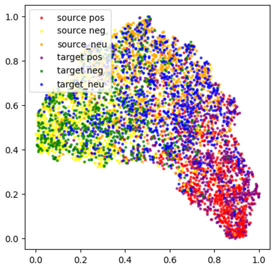 Sentiment classification is an important task in natural language processing, and it can help people make better decisions in daily life [1,2]. Over the past few decades, many machine learning methods have been introduced for classification tasks, such as logistic regression, collaborative representation, support vector machines, and neural networks [3,4,5,6,7]. With the development of the internet, a large number of user comments and other texts containing sentiment have been generated from different domains. However, the classical sentiment classification methods require that the training and testing data come from the same domain [8,9]. In addition, the training of deep networks relies on a large amount of labeled data, but texts in many domains lack sufficient labeled data. Cross-domain sentiment classification (CDSC) is a promising direction that can make full use of the rich labeled data in the source domain to assist the target domain with the lack of labeled data for sentiment classification.