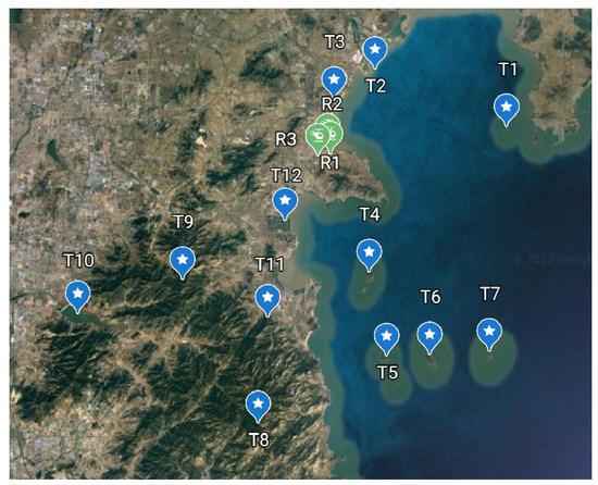 A typical MRTA problem scenario: three robots (green) to survey fourteen tasks (blue-stars).