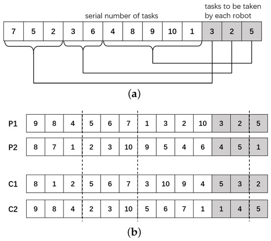 The most commonly used representation techniques for MRTA are two-chromosome, two-part chromosome [24], and multi-chromosome [26], of which the two-part chromosome representation is the most preferred. Figure 2a is a showcase of this representation, where robot takes tasks , , , robot takes tasks , , and robot takes , , , , . The limitation of the two-part chromosome technique lies in the genetic operation on the second part of the chromosome. Take Figure 2b for example: the tasks per robot would be limited to certain numbers; thus, the population diversity would be limited. In [25], a new crossover approach called TCX (two-part chromosome crossover) is proposed to overcome this drawback, but the genetic operations are complicated.