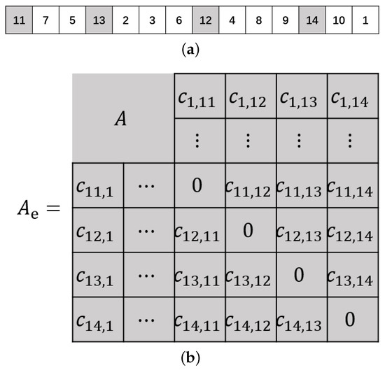 To simplify the calculation of the cost function, we extend the cost matrix A to , as is shown in Figure 3b, where the extra elements, i.e., costs between any of the depots and tasks, should be calculated in advance. This is worthwhile for a centralized MRTA problem because it is carried out only once and can be used as a lookup table in the succeeding processes.