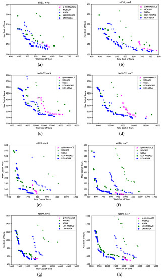 We perform the five algorithms on eight instances: ; ; , ; ; ; ; ; . The obtained Pareto fronts can be seen in Figure 4. Generally speaking, for minimization problems, objective values close to the left and bottom of the axes of the graph indicate better convergence to the true Pareto front. At the same time, the wide and even spread of the objective values means good performance on diversity and uniformity. It can be observed from Figure 4 that the LKH guidance mechanism is effective for the solutions quality improvement, both for MOEA/D and NSGA algorithms; i.e., they dominate most of the solutions of the rest of the algorithms, and they are much closer to the left and bottom side of the graph. This phenomenon is much clearer for large-scale problems such as and . On , which is the largest instance, LKH-guided algorithms gain the most obvious improvements compared with other instances, reminding that the guidance rate is only two times every 1000 iterations (). It can also be observed that the NSGA algorithms, with or without LKH guidance, perform better than the MOEA/D counterparts.