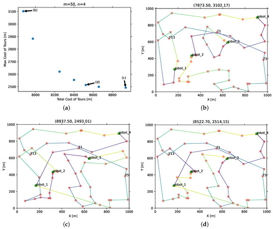 As proposed, the depots of are treated as virtual tasks that can form the one-chromosome coding of the solution. Then, the LKH-guided NSGA is performed to solve the case, resulting in the Pareto front, as shown in Figure 6a. Every dot in the Pareto front represents a near-optimal solution that can serve as a candidate for decision making. To visualize, we sample three from the solution set, see sub Figure 6b–d that correspond to objective points (b)–(d) in Figure 6a, where Figure 6b is the solution and Figure 6c is the solution. The solution achieves a total cost of tours of m, which is the optimal until now, but the lack of cooperation among robots (some robots take most of the tasks while some take very little) will inevitably lead to a long maximum cost of tours and thus the long overall completion time. The case is vice versa for the solution, where the workload among robots is relatively balanced, resulting in the shortest maximum sub-tour of m, so that the overall completion time is optimized, but the total cost of tours of m is the highest among the solution set. As a trade-off, the decision maker can also choose another solution like (d) in Figure 6a depending on the decision preference. The task allocation and each robot’s route planning of this solution are shown in Figure 6d, the maximum cost of sub-tours increases by only m (=2514.15 − 2493.01), but the total cost will save m (=8937.50 − 8522.70) compared to the solution of Figure 6c.