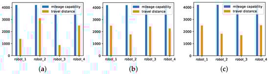 The travel distance of each robot, (a–c) correspond to the three solutions sampled from Figure 6a.