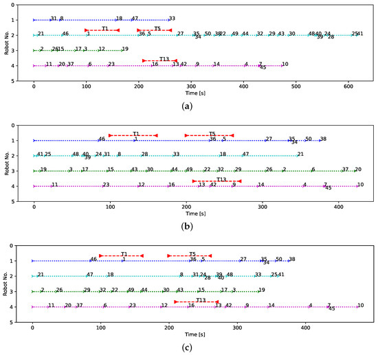 The time sequence the assigned tasks of each robot, (a–c) correspond to the three solutions sampled from Figure 6a.