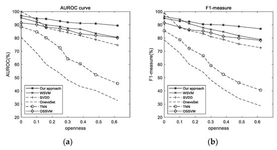 Figure 7b shows the ability of our proposed method to correctly classify known category samples when it correctly rejects unknown category samples. When openness equals 0, the F1-measure reflects the ability of algorithms to classify correctly in the closed-set scenario. The best performance is from SVDD, which uses a segmentation hypersphere to classify. We believe it is rational to integrate the idea of a hypersphere to classify UUCs and KKCs, and the experimental results support this point of view. When the openness is 0.6, the F1-measure value of our proposed method equals 86.9563%, which is 14.3343% higher than SVDD and 8.1211% higher than WSVM. The results show that our proposed method has better classification performance in open-set scenarios; therefore, it is necessary to consider using a negative-class sample during training and a Weibull distribution to prevent the model from wrongly rejecting KKCs as UUCs or wrongly classifying UUCs as KKCs in open-set scenarios.