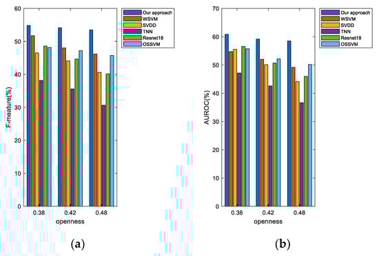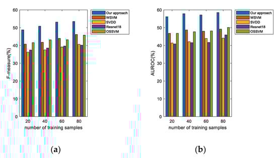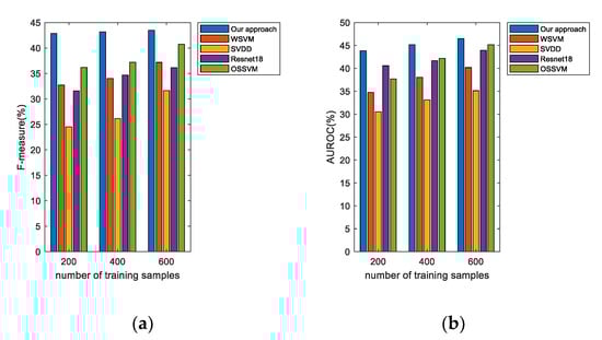 As shown in Figure 9, we set different numbers of images as the training set to verify the robustness of the algorithm, and for an openness equal to 0.48, our proposed algorithm has a higher F1-measure and AUROC value under different numbers of training samples. Due to the use of negative samples to calculate the decision surface during the training phase, the F1-measure of our proposed method is still around 50%, whereas the other algorithms are more susceptible to the number of training samples.