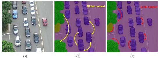 Illustrating global and local context information for UAV image semantic segmentation. (a) Input image. (b) Global context modeling. The yellow arrows represent the global contextual information. (c) Local context modeling. The red arrows represent the local contextual information.