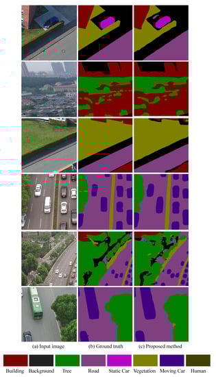 The performance of the proposed method was evaluated on two publicly available Unmanned Aerial Vehicles (UAVs) semantic segmentation datasets; UAVid [16] and Urban Drone Dataset (UDD-6) [55]. The UAVid dataset contains 42 sequences of urban street scene images. Each sequence consists of 10 RGB images of or size. Twenty sequences are for training, seven sequences are for validation, and the remaining are for testing. It consists of eight semantic categories; building, road, tree, vegetation, static car, moving car, humans, and clutter. The UDD-6 dataset is collected in multiple cities. It contains 141 RGB images that consist of training and validation sets of 106 and 35 images, respectively. Each image has or or size. It contains six semantic labels; facade, road, vegetation, vehicle, roof, and others.