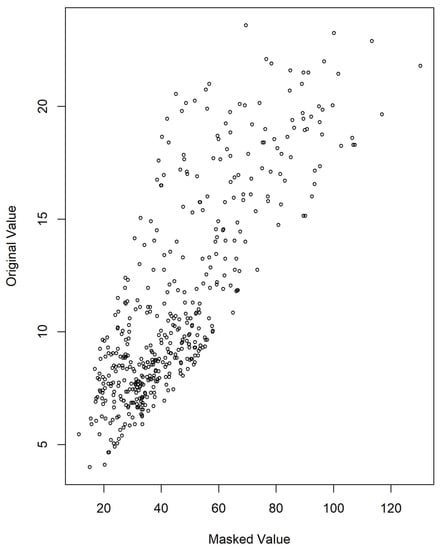Then, the data providers independently mask their raw seed-size data using the multiplicative noises C and publish their own masked values to create a collection of masked data for see size from 58 data providers. Figure 4 plots the masked data of seed size against the original values, showing the effectiveness of data masking. A given masked value corresponds to a large range of possible values of original data. This indicates that it is hard to accurately estimate the values of the original data from the masked values.