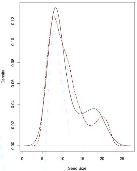 The second step is to reconstruct the density function of the original data based on the masked data and the information of the noise distribution C to generate resampled data. We applied the R package MaskDensityBM to the masked data collection and obtained the estimated density function associated with the set of the original seed-size data. The density function of the original seed size and its reconstructed density function are presented in Figure 5, which shows that the reconstructed density function preserves the two-mode feature and follows the pattern of the original density reasonably well. Then, the resampled data were generated from the reconstructed density function. The sample size required to satisfy the criterion is 1856, approximately four times the original sample size of 464.