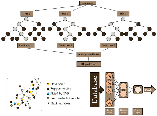 (top): scheme of a random forest (RF inspired on Karijadi & Chou (2022) [42]; (left): a support vector regression (SVR inspired on Taghizadeh-Mehrjardi et al. (2017) [43]); (right): an artificial neural network (ANN inspired on Moldes et al. (2016) [44]).