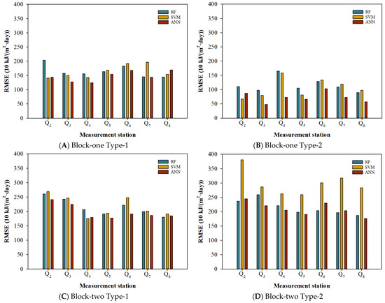 The best model for Block-two Type-1 is, once again, the ANN model, which presents an RMSE value for all the stations of 198.1 10 kJ/(m2∙day), which corresponds with an MAPE value of 12.0%. The other two models present worse results: 212.8 10 kJ/(m2∙day) for the RF model and 218.3 10 kJ/(m2∙day) for the SVM model. This increase in the RMSE values is also reflected in the MAPE values, which, in this case, are 13.8% and 15.2%, respectively. The ANN model shows the best adjustments for five of the seven stations, with the only two stations where this does not occur being Q4 (Cabo Udra (Bueu) and Q8 (Lourizán (Pontevedra)) (Table 4 and Figure 3C). In Q4, the SVM model presents a better RMSE (175.4 10 kJ/(m2∙day)) than the RMSE obtained by the ANN model (179.2 10 kJ/(m2∙day)), while in Q8, the RF model presents an RMSE value of 180.3 10 kJ/(m2∙day) against the 184.8 10 kJ/(m2∙day) presented by the ANN model.