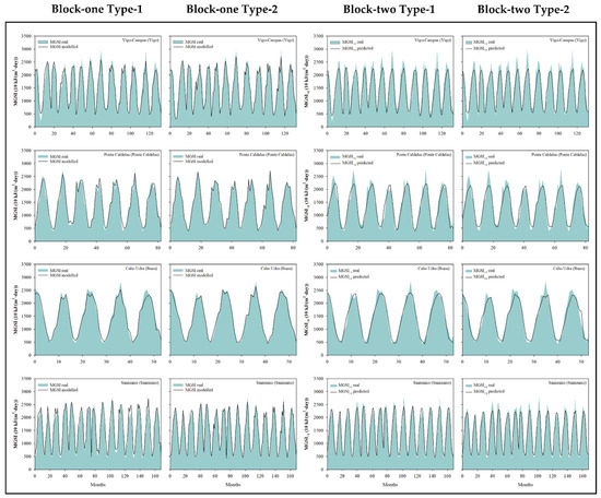 The best model for Block-one Type-2 is the ANN model, which shows an RMSE value for the Q2–8 stations of 73.0 10 kJ/(m2∙day), which corresponds with an MAPE value of 4.1%, while the RF model presents a root mean square error of 110.7 10 kJ/(m2∙day) and the SVM models present an RMSE of 102.1 10 kJ/(m2∙day). In this case, the ANN model shows the best adjustments for six of the seven stations analysed, with the Q2 station (Vigo-Campus (Vigo)) being the only station where the adjustments obtained by the ANN model are improved (Table 4 and Figure 3B). In this case, the SVM model presents better adjustments, with an RMSE of 66.7 10 kJ/(m2∙day), which corresponds to an MAPE of 4.6%.