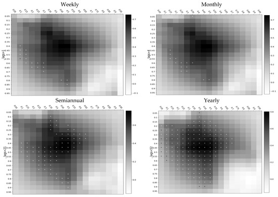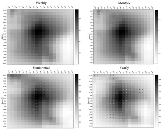 In order to conduct the cross-quantilogram analysis, we considered 19 quantiles with long high-frequency data. We employed 1, 4, 21, and 52 lags, which implied weekly, monthly, semiannual, and yearly data. Figure 2 and Figure 3 represent the results of the cross-quantile dependence from oil price to foreign assets and foreign liabilities, respectively. The results were demonstrated in the form of a heatmap matrix, where black squares indicate a strong dependency, while white squares signify a weak dependency. In addition, the significant relationship was marked with a star sign (where a white star stands for a 10% level of significance and a black star indicates a 5% level of significance).