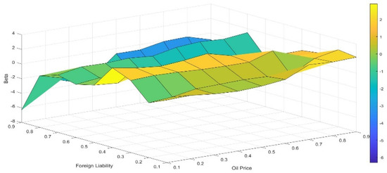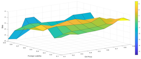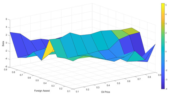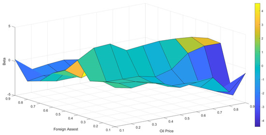 Figure 6 and Figure 7 highlight the response of foreign liabilities to the oil price. Foreign liabilities plunged under quantiles of 0.6, 0.7, 0.8, and 0.9 as a response to oil price increases under all quantiles (0.1–0.9). Figure 6 depicts foreign liabilities decreasing under the lowest quantiles (0.1 and 0.2) due to oil price shocks under 0.1 quantiles. An increase in oil price under quantiles of 0.2, 0.3, 0.4, 0.5, 0.6, 0.7, 0.8, and 0.9 led to an increase in foreign liabilities under quantiles of 0.1 and 0.2. Foreign liability increased under the quantiles of 0.3, 0.4, and 0.5 as a response to an increase in oil price under all quantiles (0.1–0.9). Thus, higher quantiles of oil price increases resulted in a decrease in foreign liabilities under lower quantiles, meaning that higher oil price was beneficial for Saudi Arabia as an oil-exporting country. Figure 7 shows that Saudi Arabia experienced an increase in foreign liabilities under the quantiles of 0.1, 0.2, 0.3, and 0.4 as a response to oil price in all quantiles (0.1–0.9), except for the 0.2 quantile of foreign liabilities and 0.1 and 0.2 quantiles of oil price. In the higher quantiles (0.5, 0.6, 0.7, 0.8, and 0.9), we observed a decrease in foreign liabilities due to oil price (0.1–0.9 quantiles). When oil price went up, Saudi Arabia experienced an increase in foreign liabilities at lower quantiles and a decrease in foreign liabilities at higher quantiles. This result could be explained by the fact that oil-exporting countries experience an appreciation for local currency with an increase in oil prices, thus, benefiting importing industries. Since Saudi Arabia follows a pegged exchange rate, oil price shocks reflect on foreign liabilities and foreign assets. However, being the most significant net oil exporter in the world, Saudi Arabia gains in a greater magnitude if the price of oil rises, meaning that its foreign liabilities eventually significantly decrease.