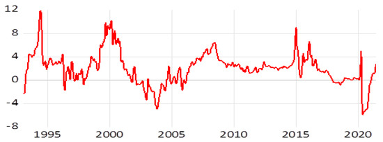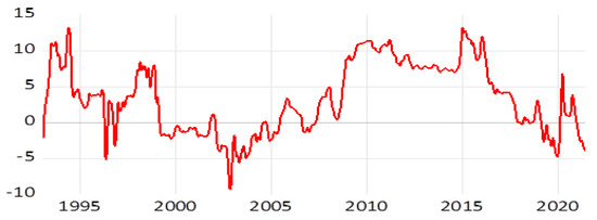 Oil price mainly acted as a net contributor over time, specifically during the periods of 1993–1999, 2007–2018, and the first wave of the COVID-19 pandemic. Alternatively, foreign liabilities appeared to be the net receiver from 1999 to 2005 and from 2019 to 2020. Figure 8 shows the volatility spillover from oil prices to foreign liabilities for 1993–2021.