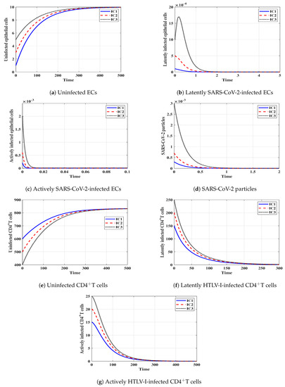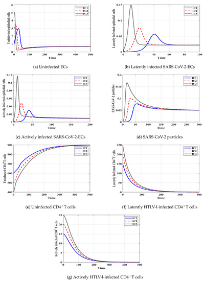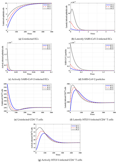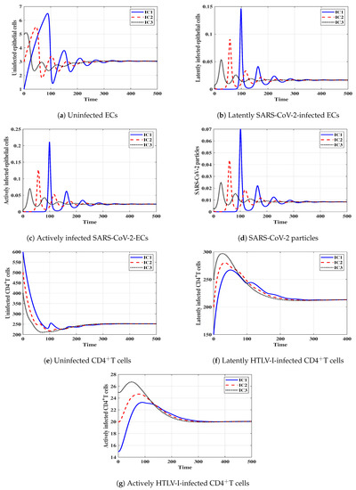 ( and ): We consider and . So, we obtain and . Lemma 2 and Theorem 4 state that the HTLV-I/SARS-CoV-2 coinfection exists and is GAS. Figure 4 shows that the solutions of the system converge to for all initials IC1-IC3. The results support the theoretical results presented in Theorem 4. In this case, a SARS-CoV-2 and HTLV-I coinfection happens, where a HTLV-I-patient gets contaminated with COVID-19. CD4T cells are animated to dispense with SARS-CoV-2 disease from the body. In any case, assuming the patient has low CD4T cell counts, the freedom of SARS-CoV-2 may not be accomplished. This can prompt extreme contamination and passing.