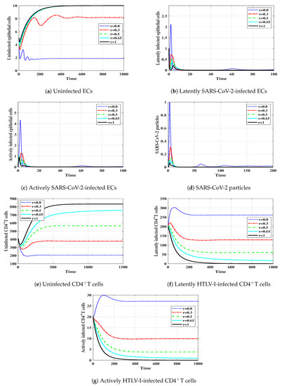 (I) The uninfected equilibrium point always exists. It is GAS when and . In this case, the patient is recovered from both SARS-CoV-2 and HTLV-I. From a control viewpoint, making and will be a good strategy. The parameter may be reduced by multiplying the parameters by or by or , respectively. Here, and are the effectiveness of the antiviral drugs for blocking the infection and blocking the production of SARS-CoV-2 particles, respectively [20]. Since there is no treatment for HTLV-I infection [11], making is rarely achieved.
