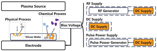 Dry etching is an important step in the chip manufacturing process. In the etching process, ion energy, ion angle and ion density play important roles in the etching rate, surface reaction and etching selectivity, respectively [1]. These ion characteristics are influenced by the voltage bias applied to the electrode where the silicon wafer is located [2]. The biasing sources directly or indirectly relate to a high-voltage DC power supply. So, how to generate the high-voltage DC power supply with simple structure, high efficiency and low cost deserves attention in the field of chip etching. The etching process [3,4,5,6,7,8] and biasing voltage are shown in Figure 1.