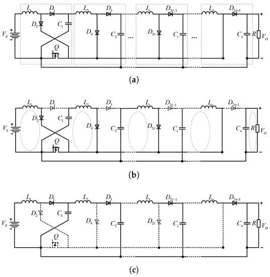 The structure of the SS-NS-ZN-HGBC is shown in Figure 2. There is only one switch, and each dashed line frame represents a basic Z-network, which includes an inductor, a capacitor and two diodes. The operations of the SS-NS-ZN-HGBC contain two stages as follows.