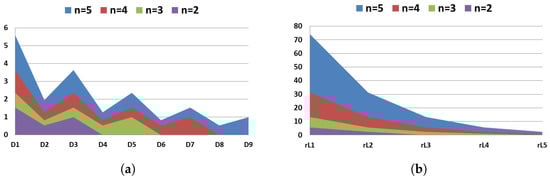 Set D as a fixed value 0.35, and calculate and when , respectively. As shown in Figure 3, no matter what the value of n, and decrease as i increases. It means that the value of and has the greatest influence on the output voltage. To obtain higher output voltage, their values should reduce as much as possible. In addition, and increase as n increases, especially . It is an important reason why the actual voltage output of the high-order boost circuit is much less than the ideal voltage output.