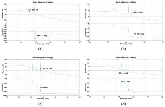 Bode diagram of the single-switch N-stage Z-network high-gain boost converter: (a) 2-stage, GM −30.6 dB, PM −171 deg; (b) 3-stage, GM −22.7 dB, PM −25.9 deg; (c) 4-stage, GM −28.3 dB, PM −4 deg; (d) 5-stage, GM −14.6 dB, PM −7.7 deg.